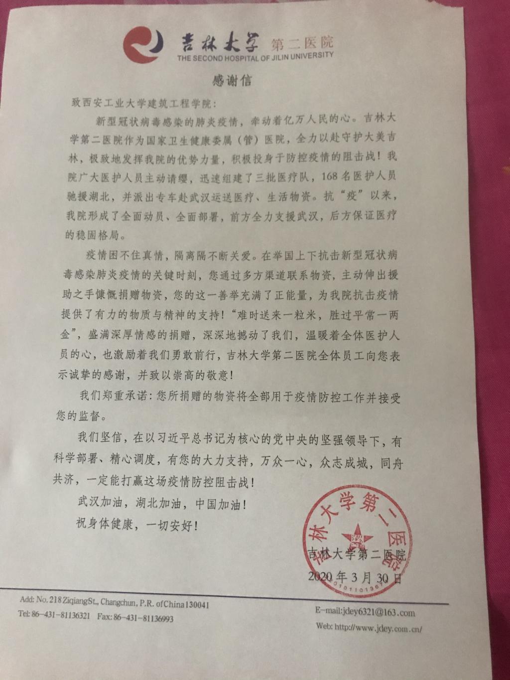自新型冠状病毒感染的肺炎疫情发生以来,疫情的进展牵动着建工公司每一名师生的心。近日,公司收到了吉林大学第二医院的感谢信,对公司教师党 员乔文婧和彭晶蓉两位老师在抗疫关键时刻向吉林大学第二医院捐赠了50副护 目镜表示感谢。此外,公司师生党员为抗击疫情捐款共计一万七千余元。
