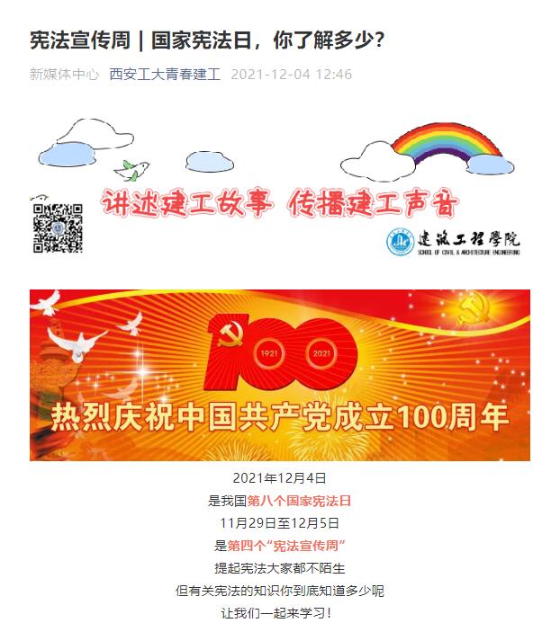 与此同时,公司党委在官方微信平台“西安工大青春建工”在国家宪法日当天推出《宪法宣传周|国家宪法日,你了解多少?》推送,以图文结合的丰富形式强化同学们宪法宣传周的意识,充分营造宪法学习教育的良好氛围。
