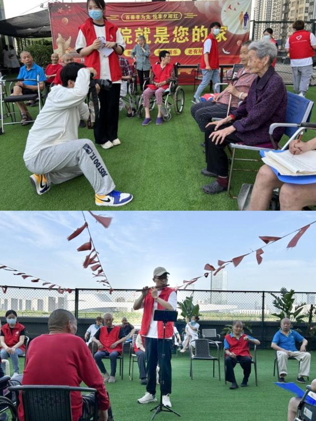 研究生第一党支部书记丁子杰在征得老人和工作人员的同意后用专业相机为在场老人单独或三两结对拍摄了精美照片,为老人留下一份珍贵的回忆。随后,到了表演节目环节,杨志豪同学为老人们笛子演奏《我的祖国》,老人们跟着悠扬的笛声轻声哼唱,一片欢快和祥和。