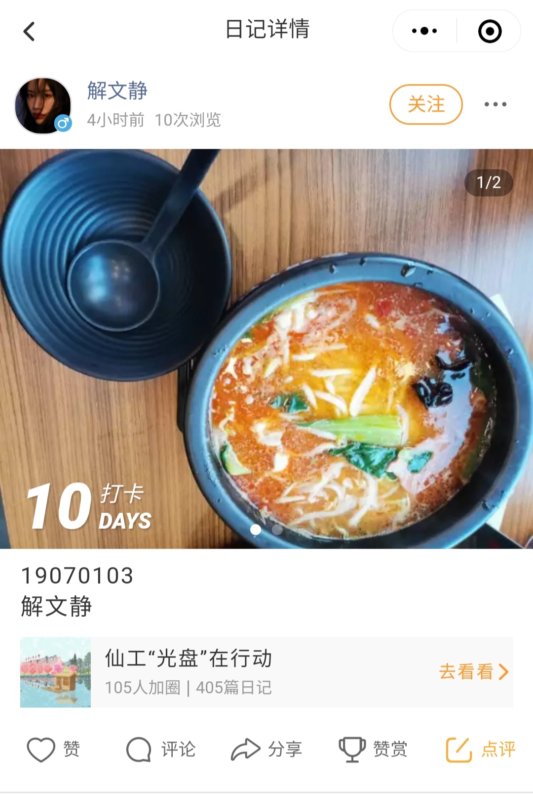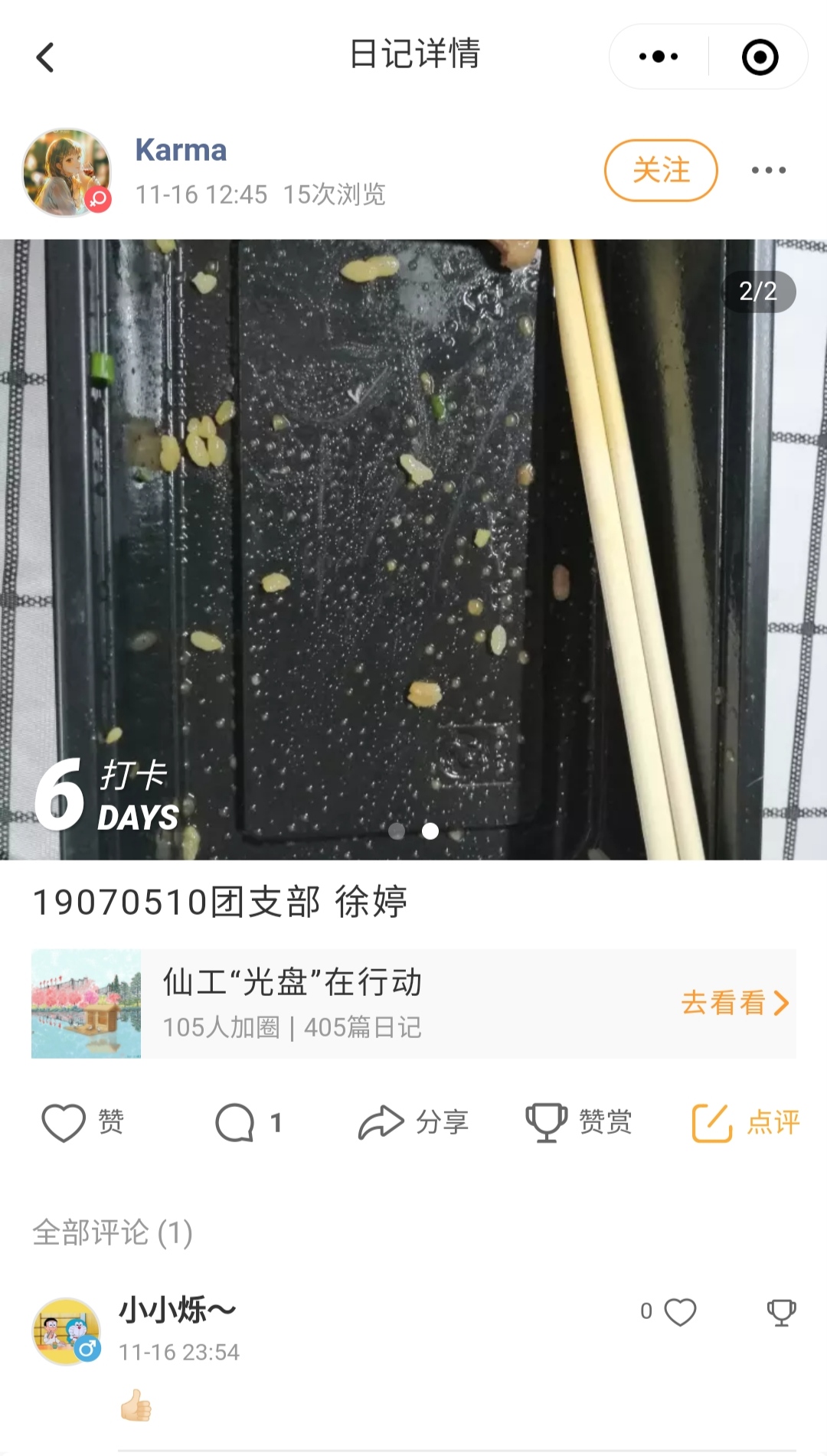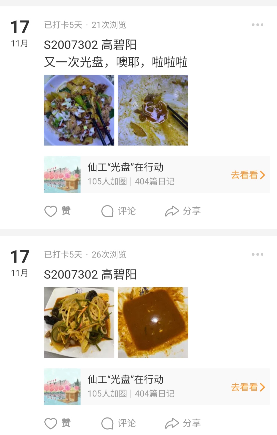为持续引导广大团员青年珍惜粮食,拒绝餐饮浪费,弘扬中华民族勤俭节约的传统美德,牢固树立节约光荣、浪费可耻意识,suncitygroup太阳集团团委于11月中旬在全校范围内组织团员青年开展了“仙工‘光盘’在行动”每日打卡主题团日活动。