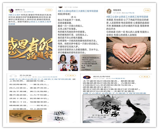 本次活动以“感恩相遇、期待未来”为主题,采用线上线下相结合的方式开展,参与员工在线上通过微博留言互动,线下写下自己的感恩心语,表达对亲人、朋友以及老师的感谢。感恩是一种生活态度,是一片肺腑之言,是每一个人最起码拥有的美德。只有懂得感恩的人才会真正得到别人的尊重,才能真正得到他人的认可。借助于公司微博平台,同学们有机会说出心中最想感谢的人和事,让温暖洋溢在整个校园中。