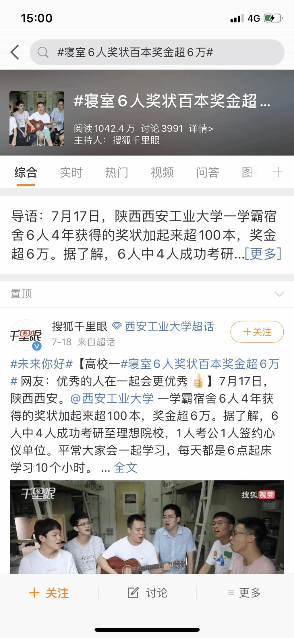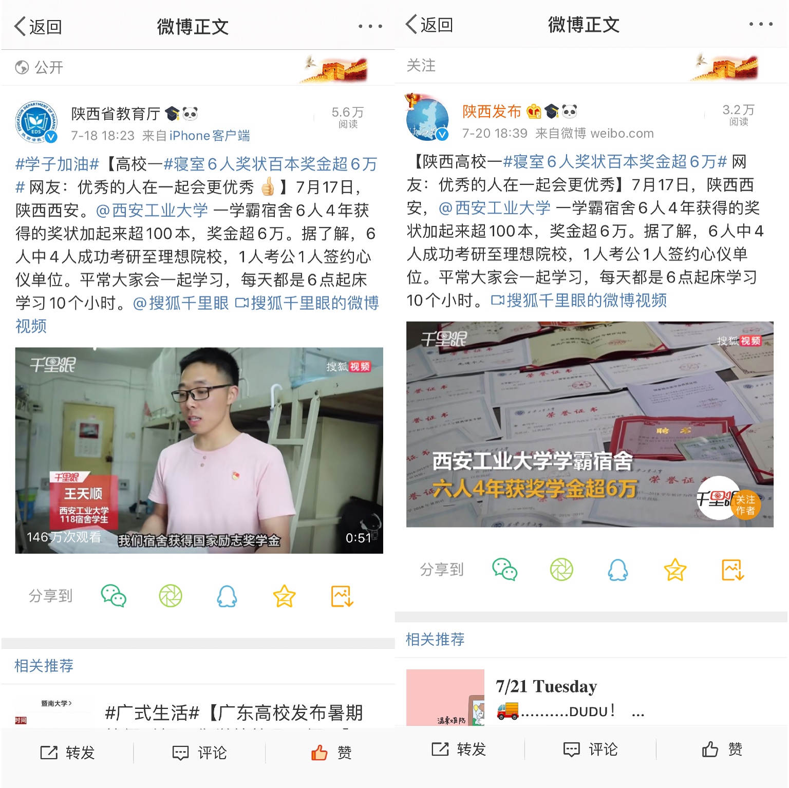 近日,微博上一则#寝室6人奖状百本奖金超6万#的话题引起网友热议,并长期占据了西安同城热搜榜第一位。suncitygroup太阳集团118宿舍的学霸事迹被广泛报道,受到多家媒体关注。陕西发布、陕西省教育厅、中青网、西安发布、搜狐新闻、网易视频、三秦青年等官方媒体对该消息进行转发报道,截止21日中午,该话题微博阅读量已达到1043.6万,讨论数超过4000,引起强烈反响。
