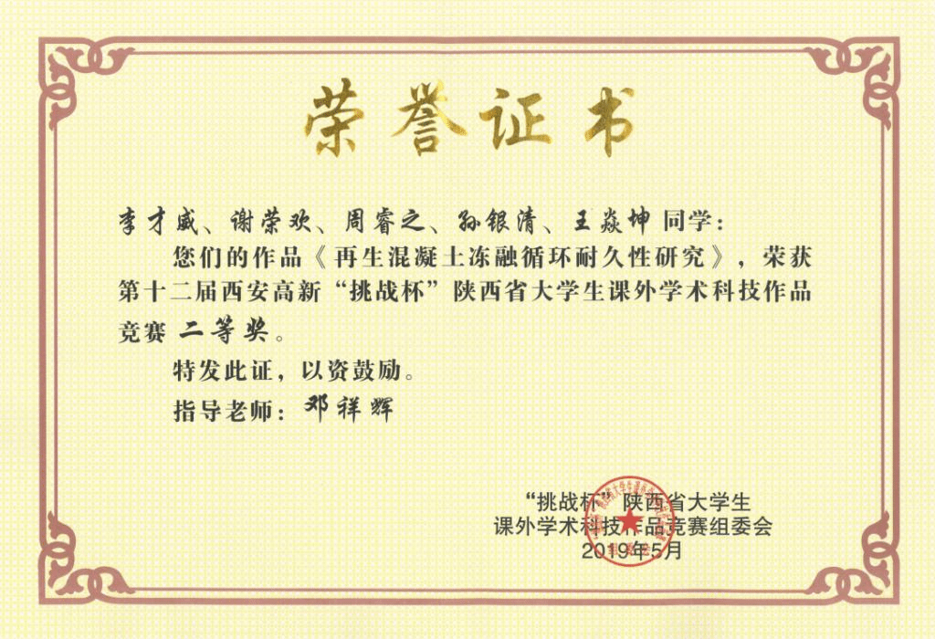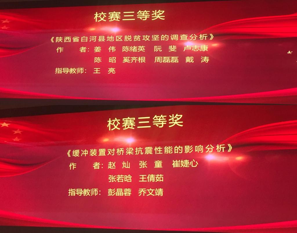 校赛中,公司教师王亮指导的作品《陕西省白河县地区脱贫攻坚的调查分析》,彭晶蓉及乔文靖共同指导的作品《缓冲装置对桥梁抗震性能的影响分析》均获得校级三等奖。省赛阶段,由公司教师邓祥辉指导、李才威等本科生完成的作品《再生混凝土冻融循环耐久性研究》获得省级二等奖。