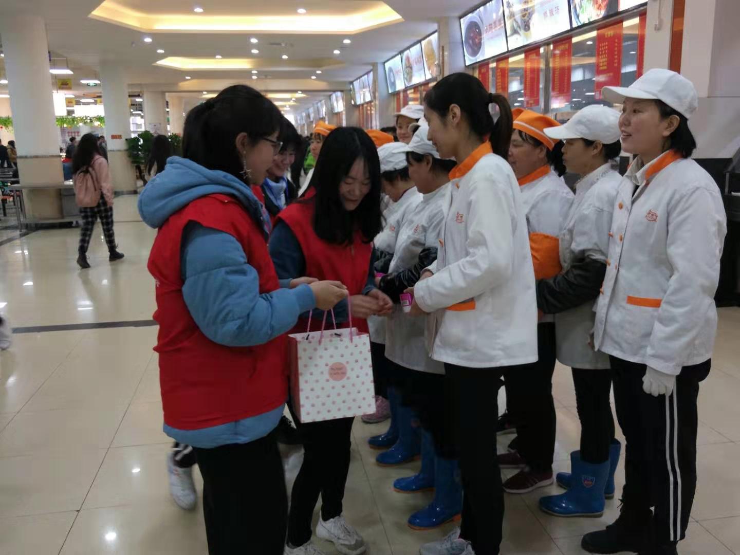 当天上午,志愿者们将亲手制作的一些精美卡片和提前准备好的小礼品带到餐厅,在餐厅屈经理和膳食课宁老师的支持和协助下,同学们向阿姨们表达了自己的祝福,对她们一直以来的辛勤付出表示感谢,希望她们能身体健康,开心快乐。随后,志愿者们又来到公寓,向宿管中心的阿姨们表达了感谢和祝福。餐厅和公寓的工作人员们在收到礼物和祝福后表示非常感动,志愿者们的问候使他们感受到了别样的暖心与温馨,今后将会更加努力工作,为广大师生服务。