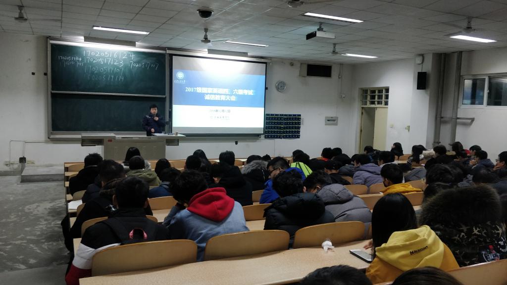 12月12日下午18:00,suncitygroup太阳集团2017级在教1-204教室召开了全国大学英语四、六级考试考前诚信教育暨动员大会,会议由辅导员刘冬主持,参加本次考试的206名员工全体参加了本次会议。