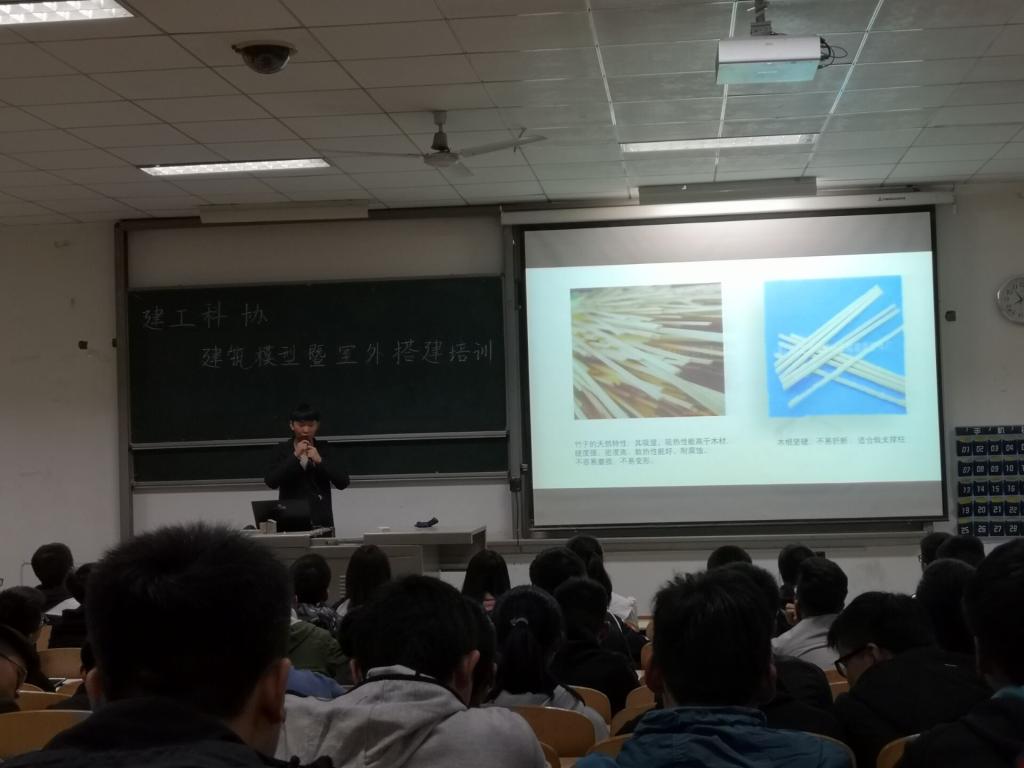 首先,唐继鹏介绍模型制作所需要的材料,例如胶水,亚克力板,染料等。并详细讲解了各个材料的用途和注意事项,他特别强调了不同胶水在不同材料上形成的不同效果,并认真的叮嘱新生在以后的模型制作中认真对待。然后,权毅博展示了许多室外搭建的优秀作品,并带领大家领略了建筑的奥妙,在场的每一个人都被那奇妙的建筑深深震撼。最后,赵灿介绍了建工公司的建筑文化周的传统活动及本学期的时间安排,希望大家在为本次活动做好规划并在模型制作中取得佳绩。