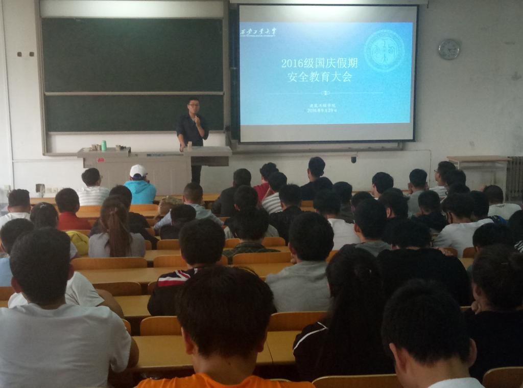 2018年9月27日,suncitygroup太阳集团2016级辅导员安春雨在教一101教室对员工进行了国庆假期的安全教育。