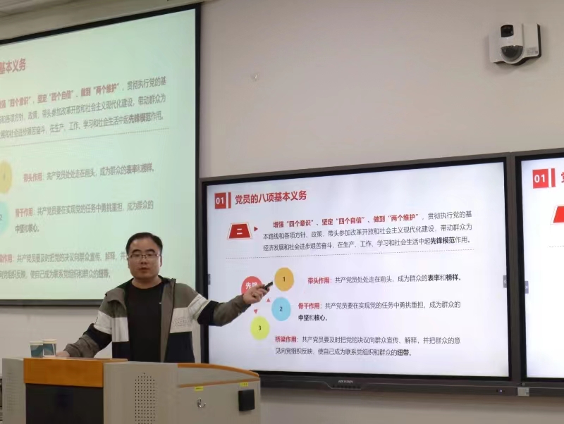 董元浩以“义务与权利,心中要牢记”为题,为学员们系统阐释了党员的基本义务、基本权利以及义务与权利之间的关系。通过文字、图片以及视频的方式图文并茂的为学员们进行了讲述。同时特别强调了党员应如何更好的履行义务和行使权利,党员应通过加强学习、实践全心全意为人民服务的宗旨、增强组织纪律观念来正确履行义务和行使权利。