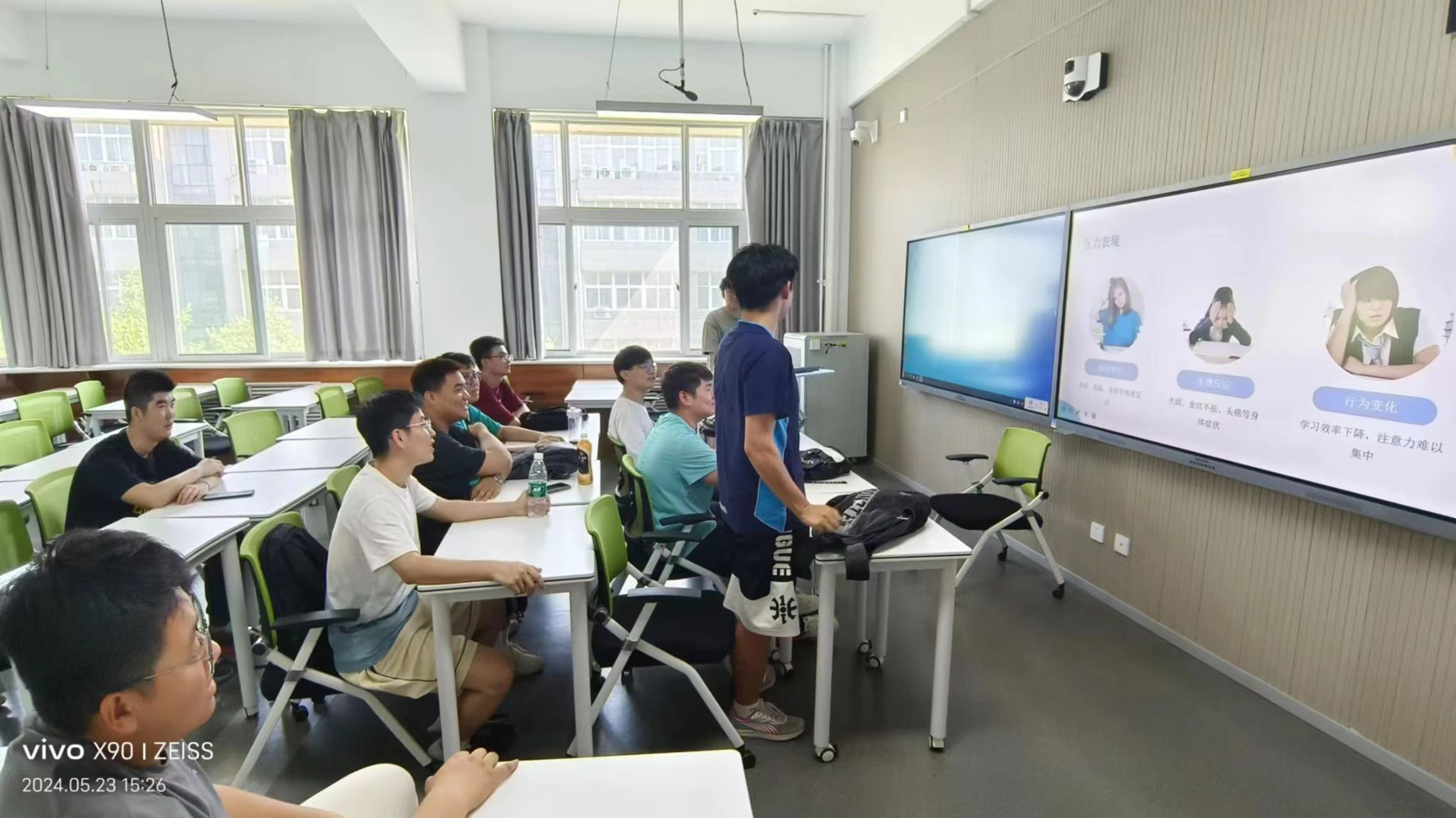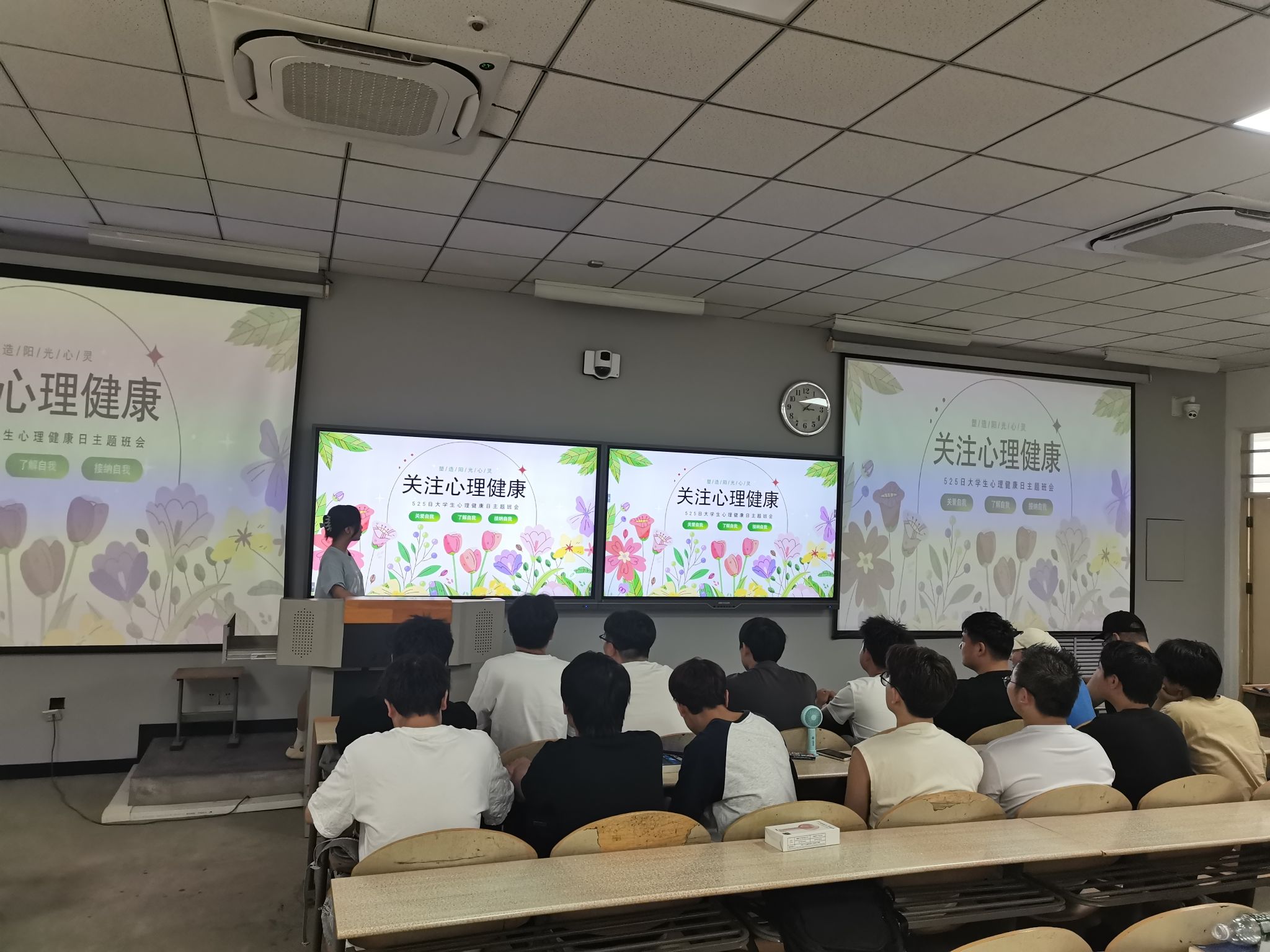 班会伊始,各班班级心理委员向同学们介绍了本次班会的目的和意义,强调了考试期间心理健康的重要性。考前焦虑是一种正常的心理反应,但过度焦虑则会影响考试发挥。同学们在备考过程中往往会面临各种压力和挑战,如焦虑、紧张、失眠等,这些心理问题不仅会影响考试成绩,还会对身心健康造成负面影响。因此,建议同学们在备考过程中保持良好的生活习惯和作息规律,合理安排复习时间,避免过度劳累和紧张。
