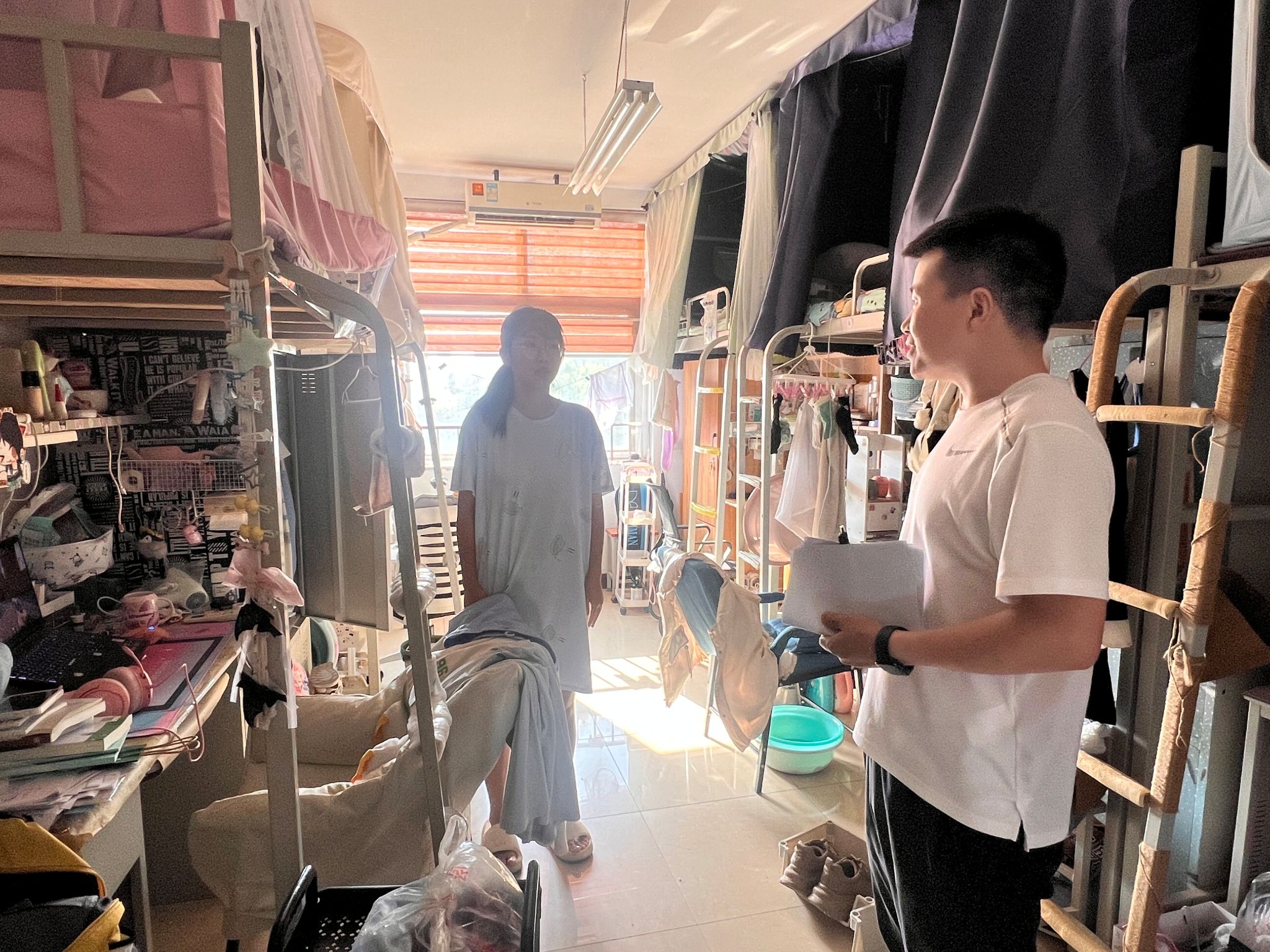 走访宿舍中,辅导员与员工交流了解近期校园生活学习情况,对大家关心问题及时答疑,向同学们宣讲公司文明宿舍创建知识,鼓励大家以良好舍风促进学风建设。
