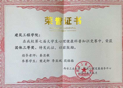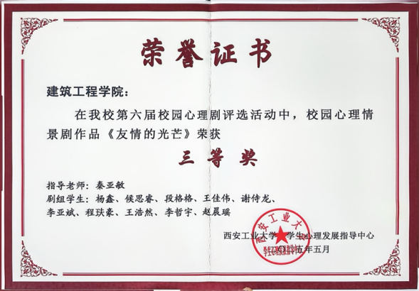 3 月 29 日,在 “心建工程,心理砼行” 心理健康知识竞赛中,段格格、李亚斌、樊是卿三位同学组成的公司代表队,凭借扎实的心理学理论功底和默契的团队协作,从众多队伍中脱颖而出,荣获校级三等奖。而 “心海扬帆,剧映人生” 心理剧剧本海选赛激发了同学们的创作热情,4 月初公司师生演绎的心理剧《友谊的光芒》更是凭借深刻主题与精彩表演,荣获校级三等奖,展现出建筑学子的青春风采。4月初公司提交的员工心理健康教育成果典型案例《自己的人生还是要自己签到》(秦亚敏)荣获suncitygroup太阳集团员工心理健康教育成果二等奖,员工心理健康教育成果典型经验《用爱守护 以爱育心浇灌希望》(秦亚敏)荣获suncitygroup太阳集团员工心理健康教育成果三等奖。