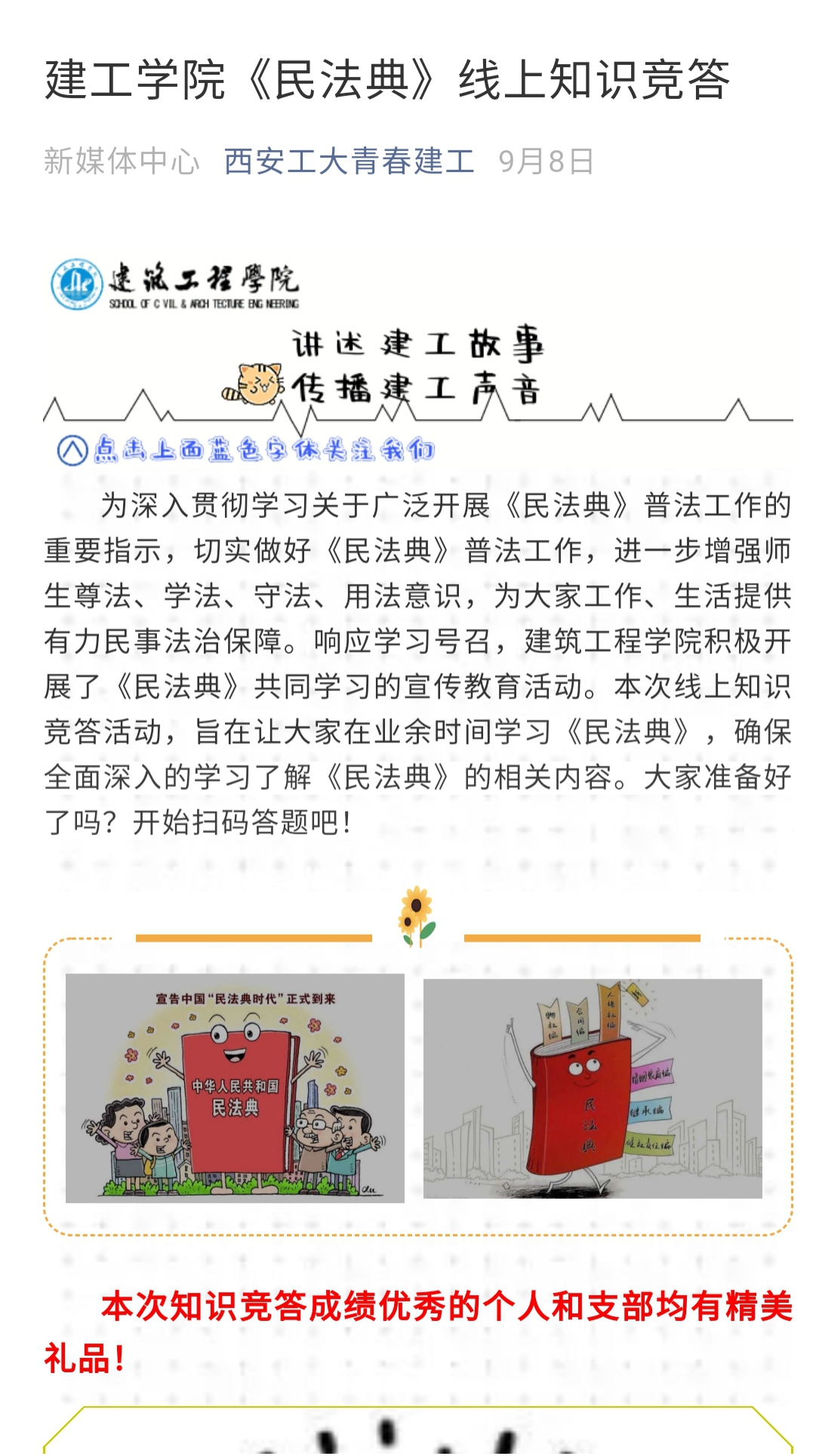 本次活动在公司党委的指导下,结合公司特色,由专人搜集了包括单选、多选和判断共40题,依托“西安工大青春建工”微信平台进行线上知识竞答。活动中,分工会小组广泛宣传动员,鼓励大家全面深入学习了解《民法典》的相关内容,占全院教师总人数85%的老师参与了本次活动,活动效果非常好。