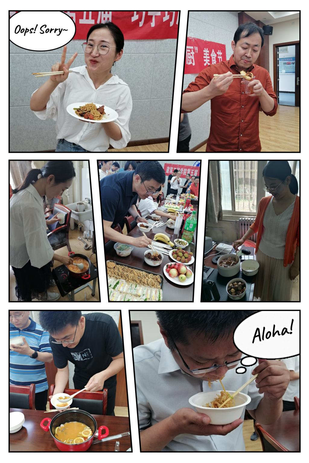 蛋挞、油饼、卤牛肉、蒸卤面、孜然炒肉、糖醋排骨、麻辣虾尾、冬阴功汤、椰蓉奶豆腐、冰激凌蛋糕……30余种美食纷纷呈现在大家面前,让人目不暇接、垂涎欲滴、食指大动。经过品尝,大家一致认为,丁潇老师的油饼、刘瑾老师的香菜酱、王海荣老师的蒸卤面、党晓芳老师的卤牛肉、周雪峰老师的桂圆银耳羹、吴佳妮老师的冬阴功汤等美食是名副其实的“建工美食”。