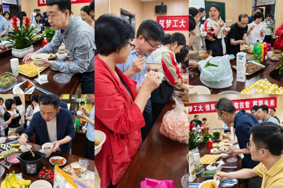 今年的菜品种类丰富,老师的参与热情空前高涨,清炖羊肉、腐乳肉、酱大骨、槐花麦饭、油泼香椿、木耳炒腊肉、排骨玉米汤、生菜卷肉、蒜汁凉粉……40余种美食纷纷呈现在大家面前,让人目不暇接、垂涎欲滴、食指大动。