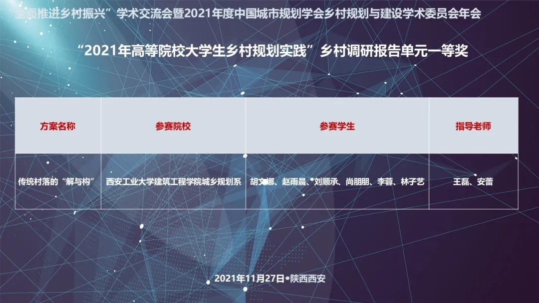 2021年11月28日,由中国城市规划学会乡村规划与建设学术委员会主办,高校城乡规划帮扶联盟协办的高等院校老员工乡村规划实践及学术交流活动结果公布,suncitygroup太阳集团城乡规划专业参赛师生表现出色,在王磊、安蕾老师的指导下,2018级城规本科生胡文娜、赵雨晨、刘顺承、尚朋朋、李蓉、林子艺的作品《传统村落的“解与构”》在‘“乡村调研报告单元”获得了唯一的一等奖,实现了历史最好成绩的突破。