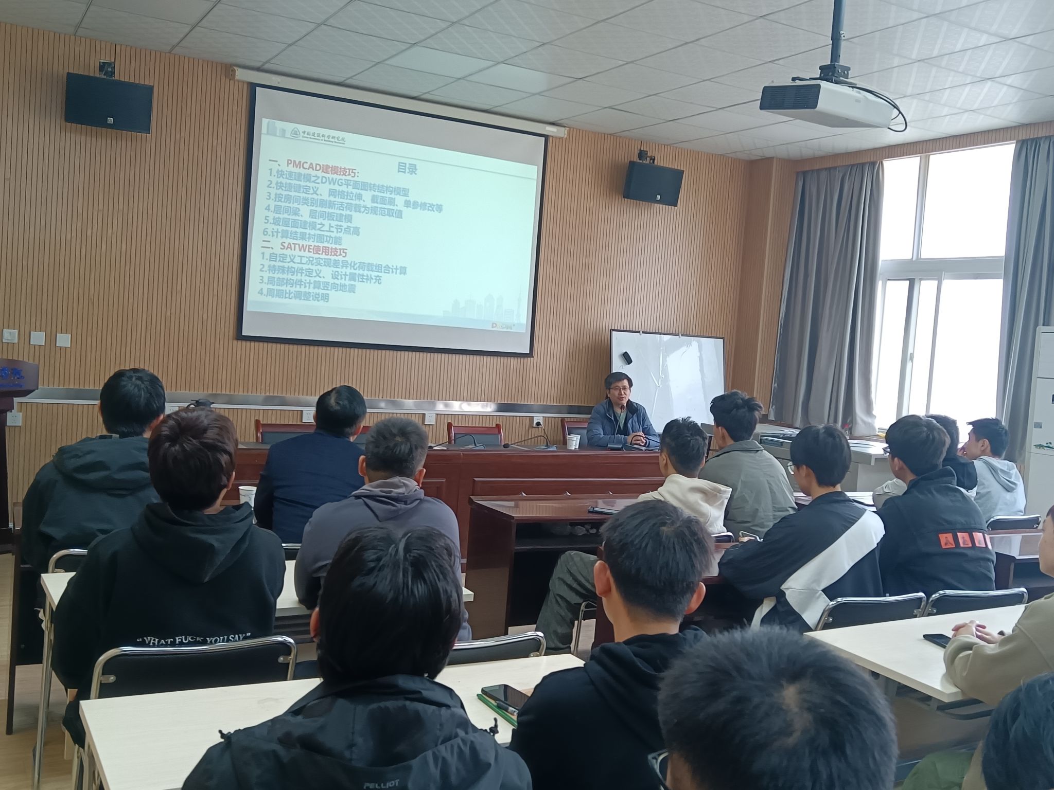 张老师通过亲自演示最新版PKPM软件的操作,以框架结构设计为例,从结构建模、规范应用以及SATWE分析等方面,深入浅出地介绍了软件的操作流程,并与现场员工进行了良好地互动交流。讲座最后环节,张旭光老针对毕业设计梳理了多个典型设计问题,与师生们分享交流。