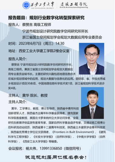 为了适应日益增长的城乡规划编制、管理内容的复杂性和科学性,更好地满足现代社会对于城乡规划行业的需求,促进城乡规划专业的高质量发展。suncitygroup太阳集团将于2023年6月7日举办题为《规划行业数字化转型探索研究》的主题报告,本次报告邀请到宁波市规划设计研究院数字空间研究所所长,浙江省国土空间规划学会规划大数据应用专业委员会蔡赞吉高级工程师主讲,重点探讨在规划行业如何运用人工智能、大数据等技术方法,实现城乡规划高质量发展、国土空间规划一张蓝图建设等相关内容。诚邀校内外相关领域的专家、学者莅临指导。会议具体安排如下: