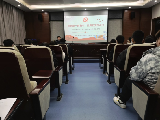 贾建利老师以“团结统一的基石,拒腐防变的法宝——中国共产党的组织制度和党纪党风”为题讲授本次课程。老师主要为同学们讲授了三点内容,分别为中国共产党的组织原则和组织机构、中国共产党的纪律和中国共产党的优良作风。