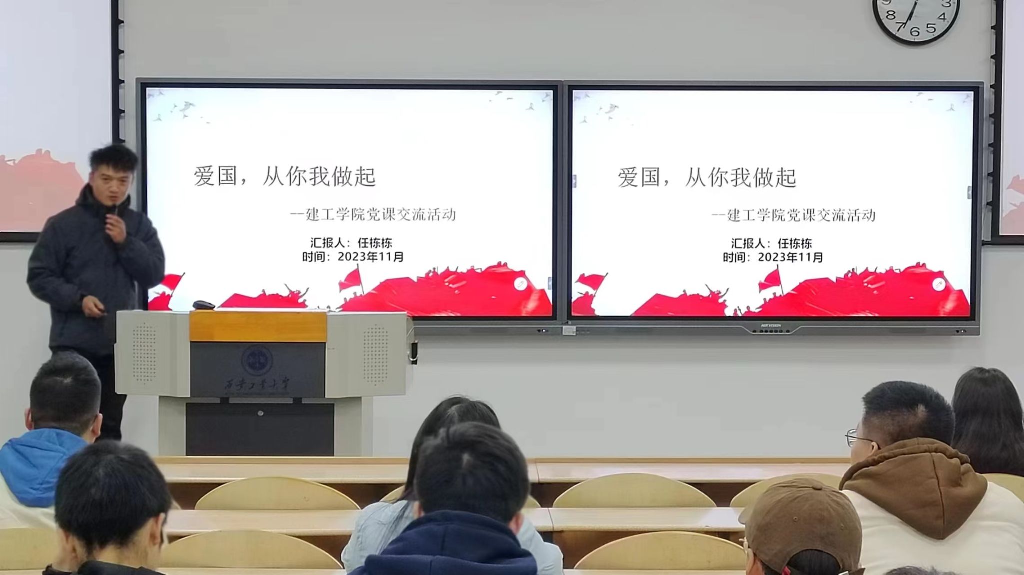 任栋栋以为“爱国,从你我做起”为题,从自身参军的时光讲起,从为什么入党、参军、军营生活回顾和爱国主义行动三个方面进行了细致的讲解。首先任同学为大家讲述了自己的入党和参军的初心,强调爱国是作为一个党员最基本的要求,作为积极分子,应当时刻怀着一颗热忱的心来保卫祖国,然后他为学员播放了一段征兵入伍的视频,并结合视频为大家讲述了自己在军队的时光和收获。最后,任栋栋从八个方面为大家讲述了当代老员工如何弘扬爱国主义精神,践行爱国之志。